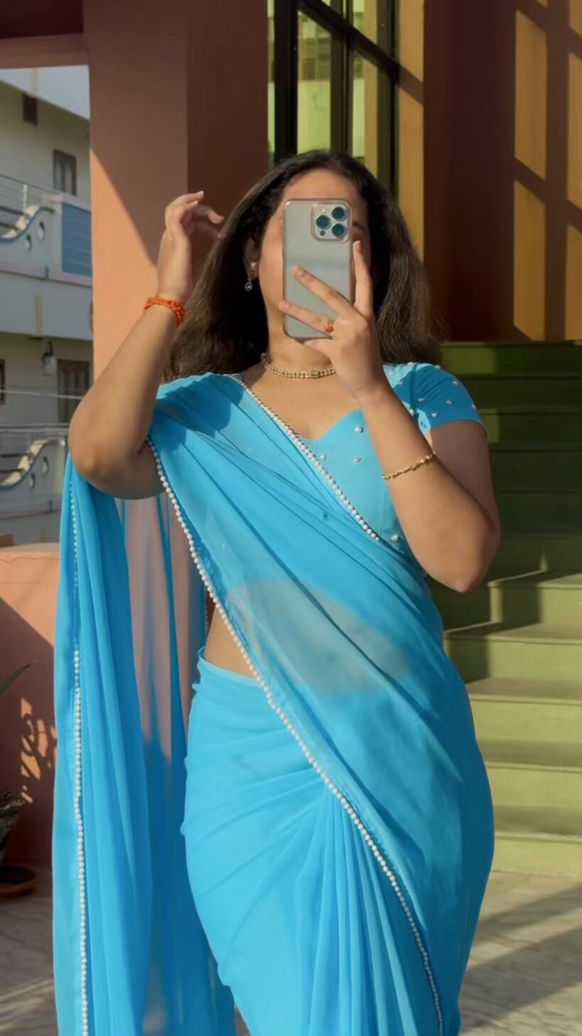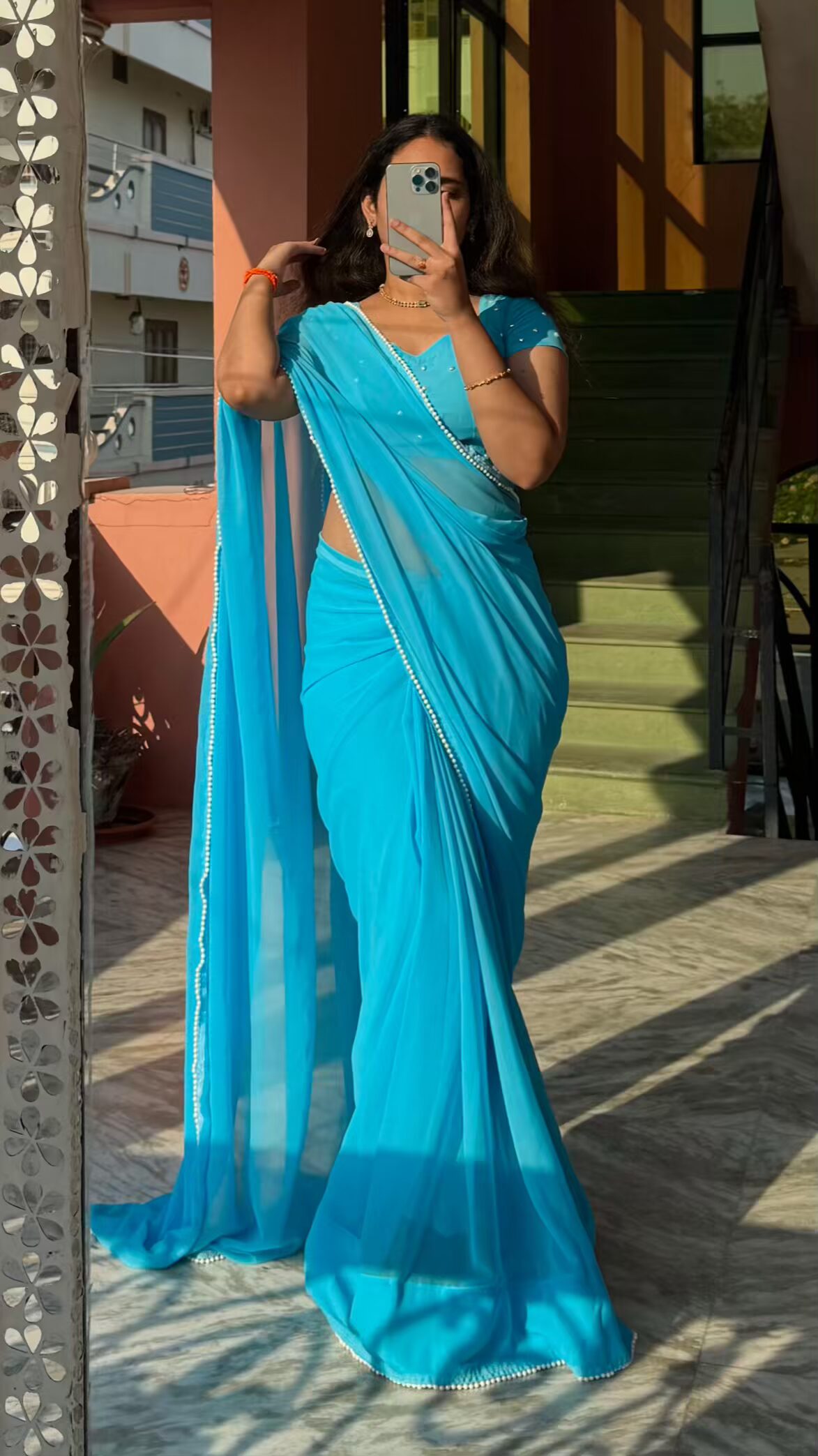 Georgette fabric with stitched pearl blouse and pearl lace with falls