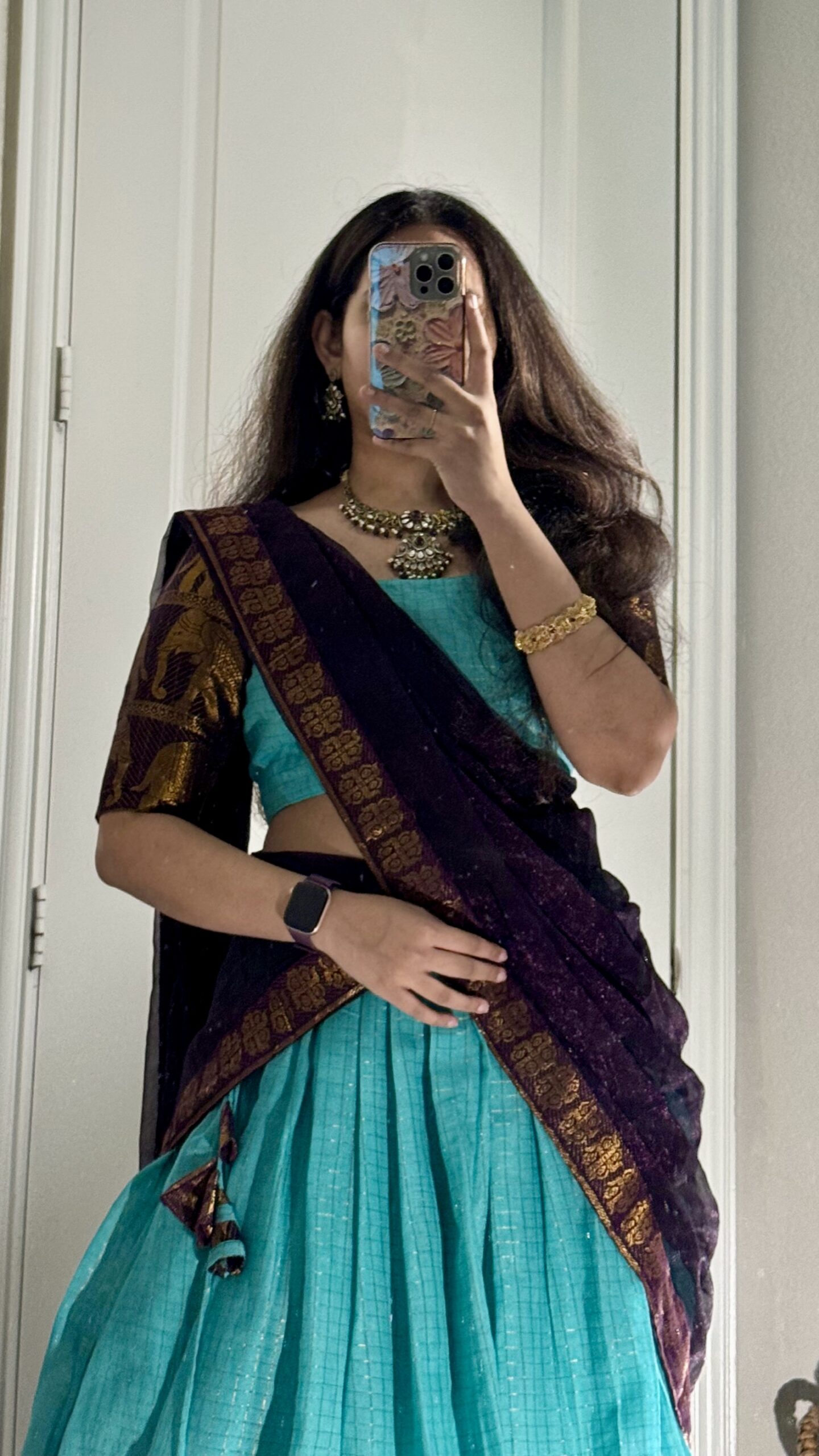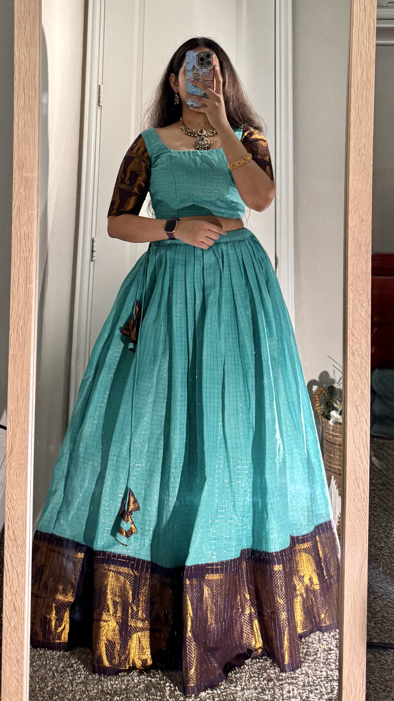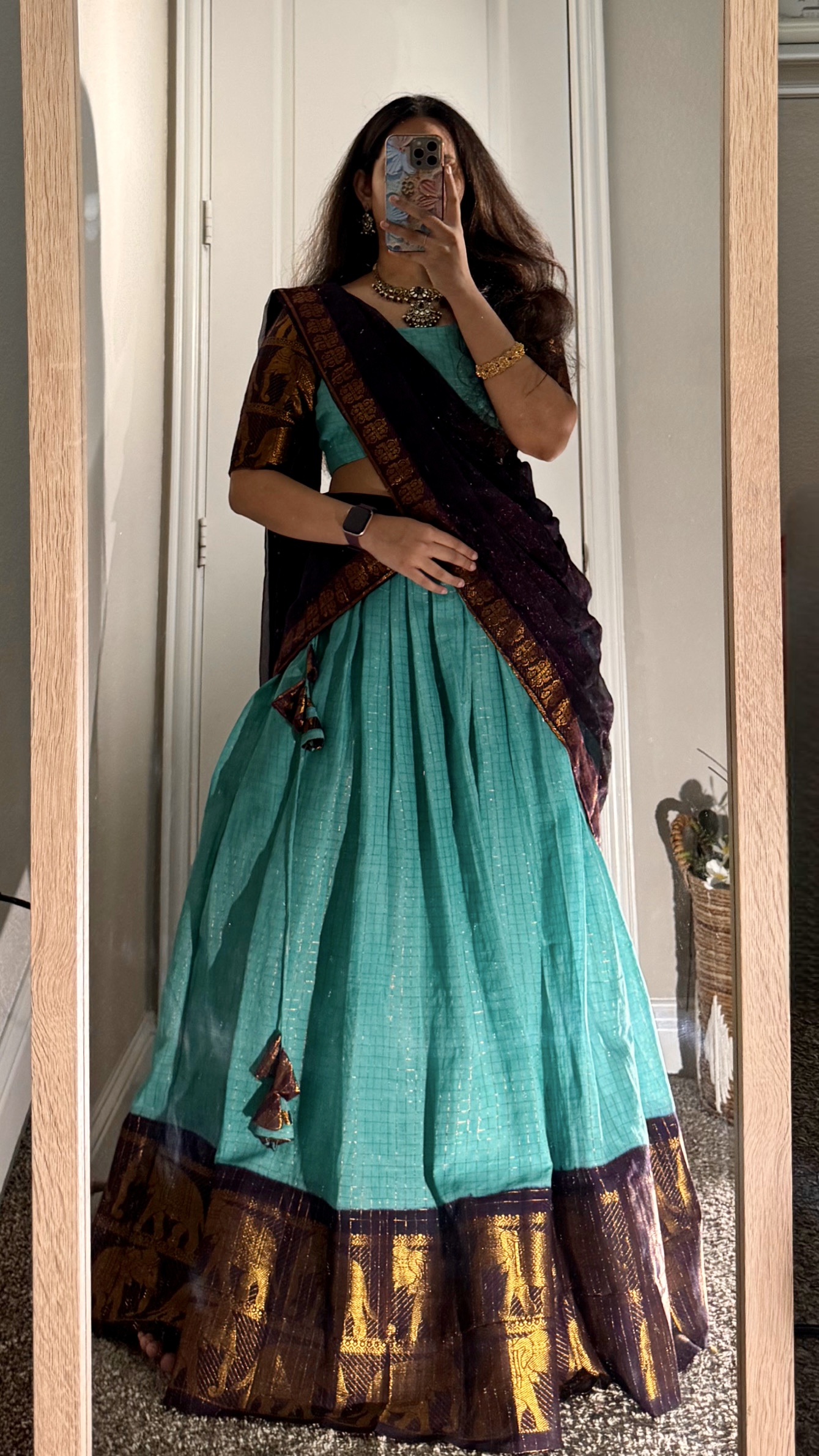 Sungudi handloom fabric with gold zari borders skirt flare is 5.5 meters and duppata is 2.9 meters zip is attached to both skirt and blouse with dori for blouse
