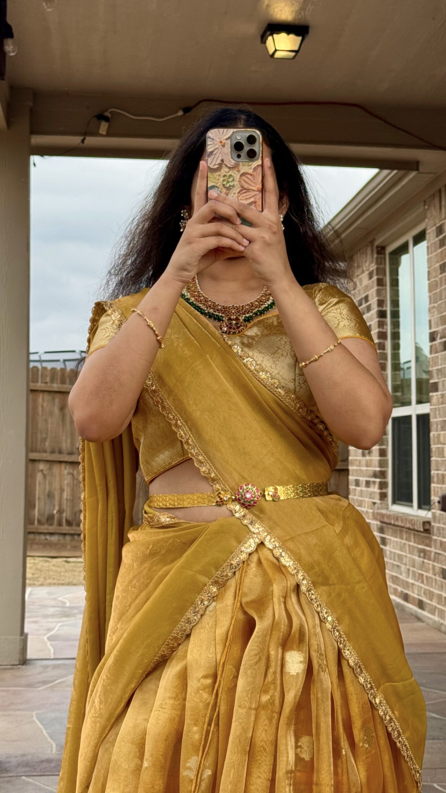 Sungudi handloom cotton fabric half Saree with gold zari border dress flare is 5 meters comes with lining duppata is 3 meters