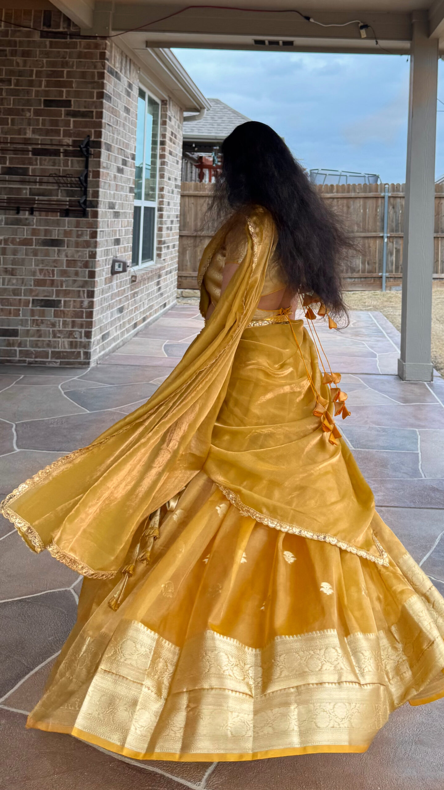 Kanchi pattu lehenga with gold zari borders and sequence zari temple design all over the skirt with gold zari blouse skirt flare is 6 meters bandhini Duppata is 2.8-3 meters comes with lining dress is completely stitched zip is attached to blouse and skirt with dori
