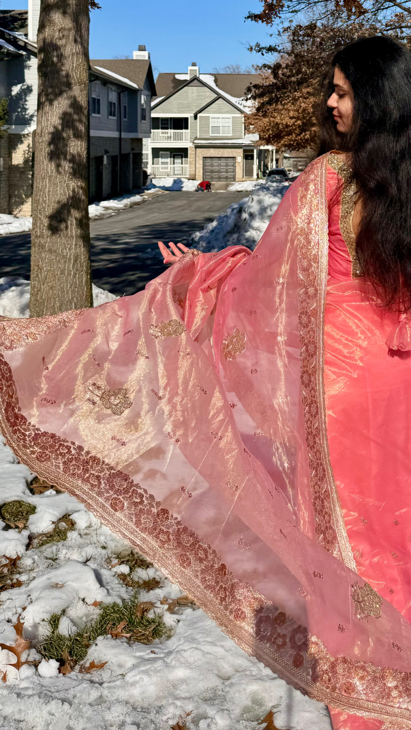 Zarikota fabric with silver and gold flower sequence all over the skirt with net duppata skirt flare is 6 meters