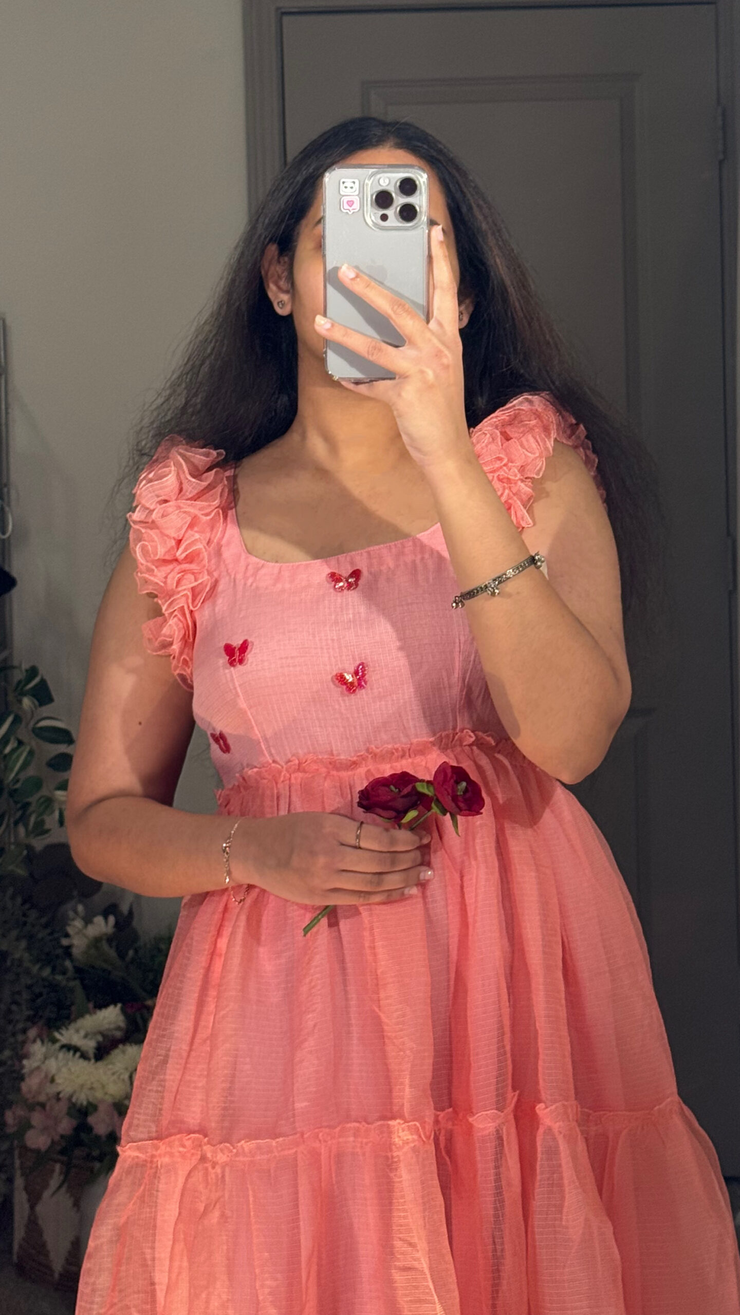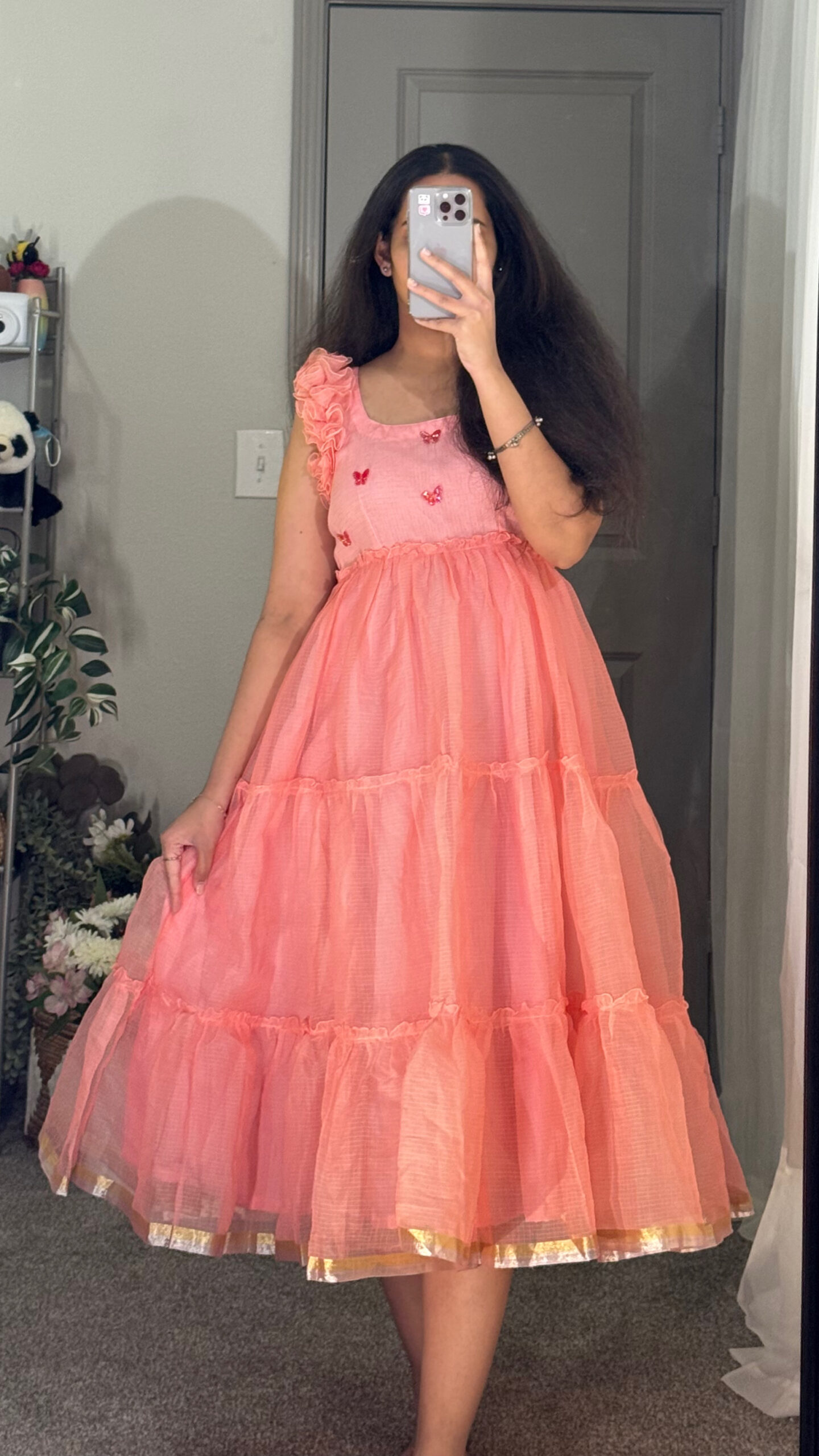 Hakoba cotton rose dress with scallop cut on bottom of the frock and on sleeves comes with lining and it has both sides pockets for dress