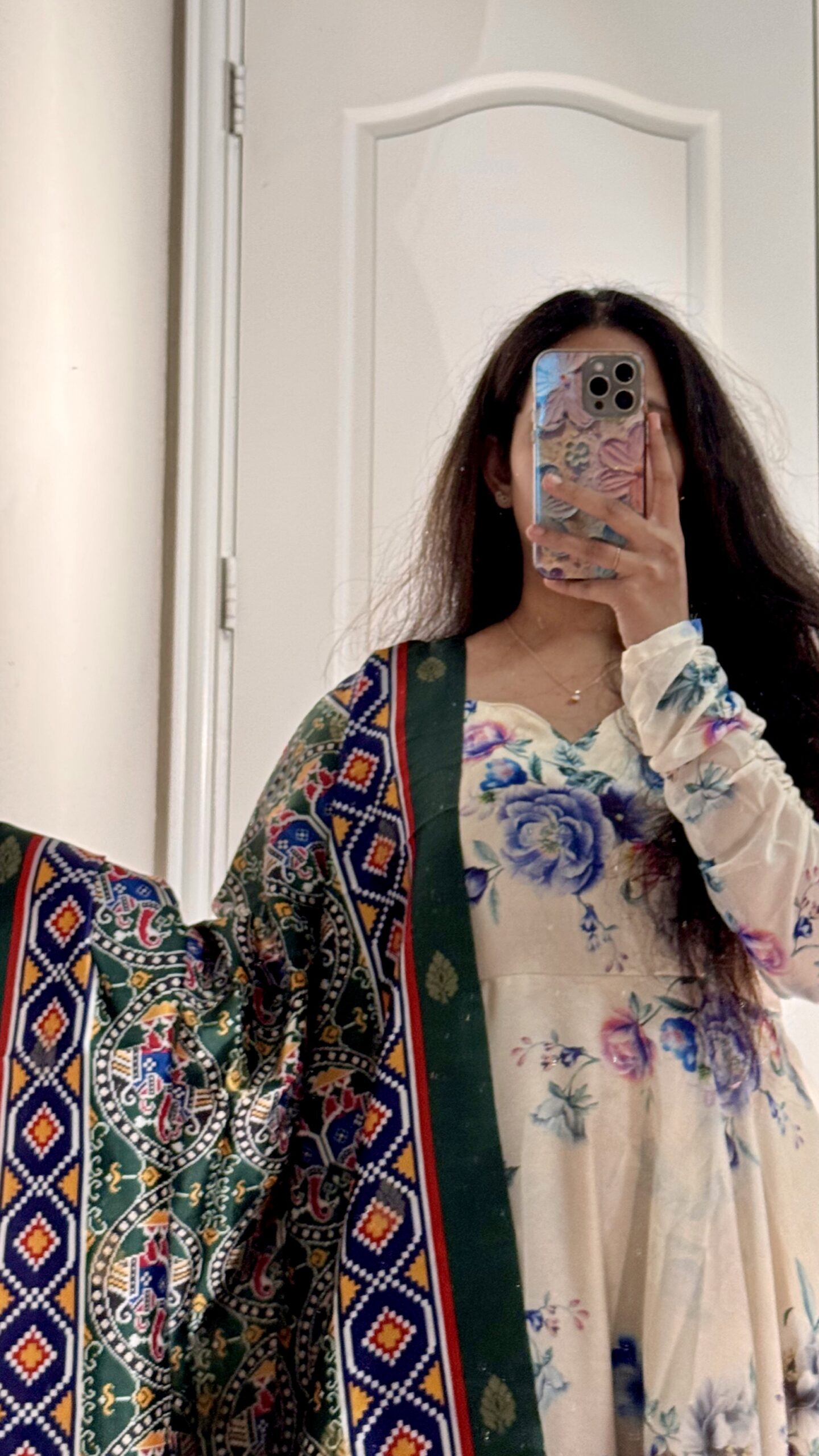 Soft muslin silk fabric alia cut frock with digital printed flowers embroidered with kundans on yoke part