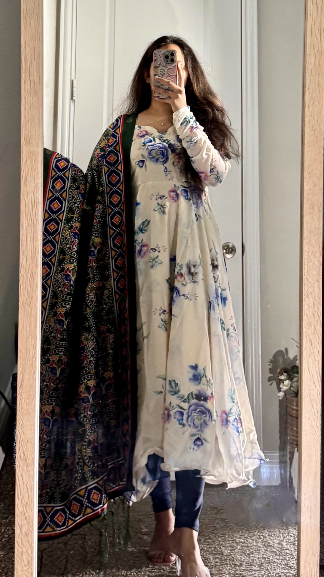 Floral soft georgette fabric comes with sleeves dress flare is 7 meters comes with lining sleeves can be customized please mention that in additional specifications box