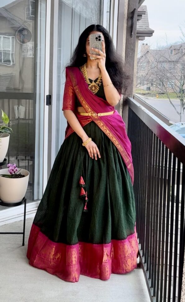 Narayanpet cotton half Saree with georgette duppata comes with lining lehenga flare 5-6 meters blouse has Doris and hooks on back