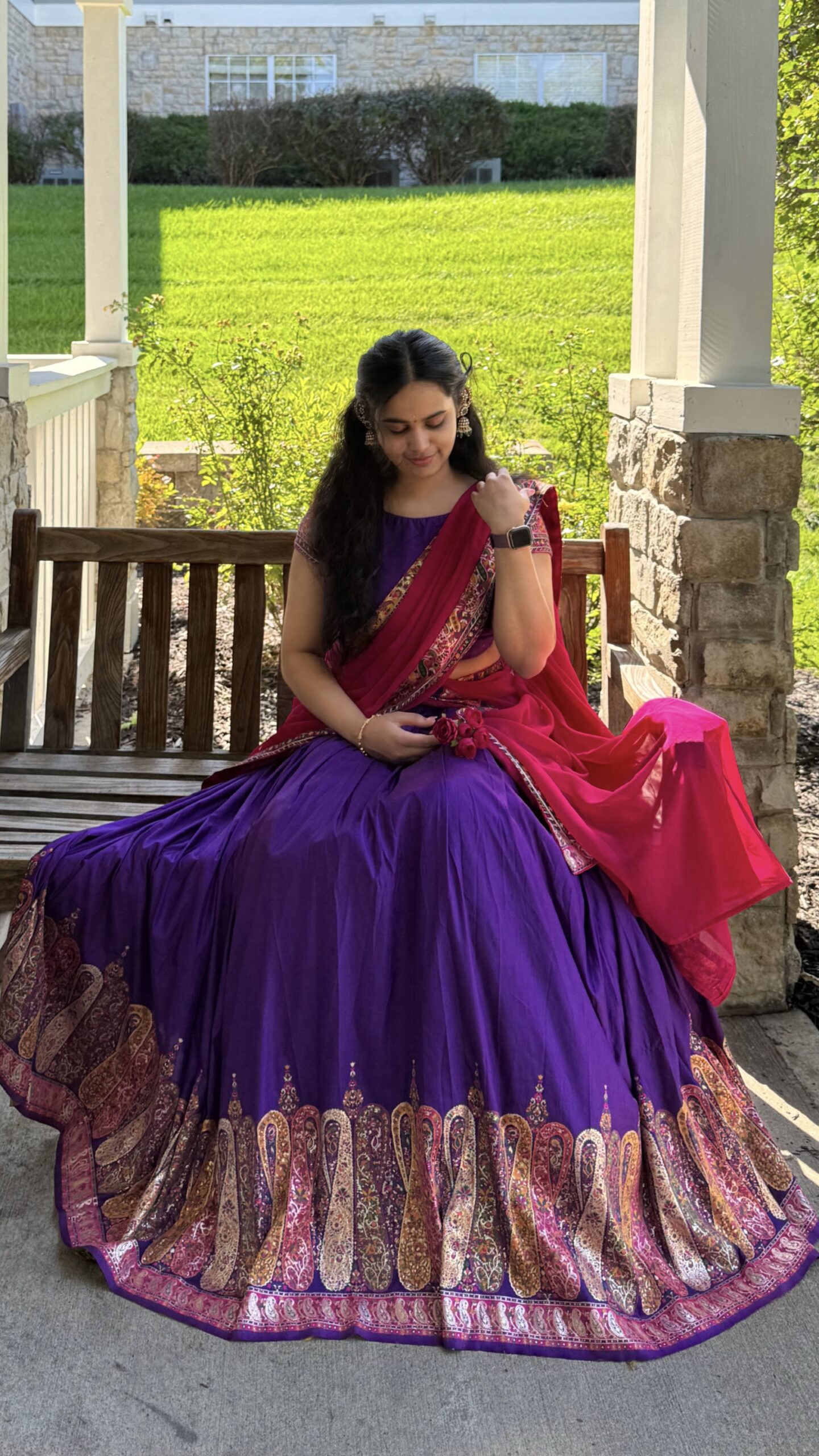 Kanchi pattu lehenga with gold zari borders and sequence zari temple design all over the skirt with gold zari blouse skirt flare is 6 meters Duppata is 2.8-3 meters comes with lining dress is completely stitched