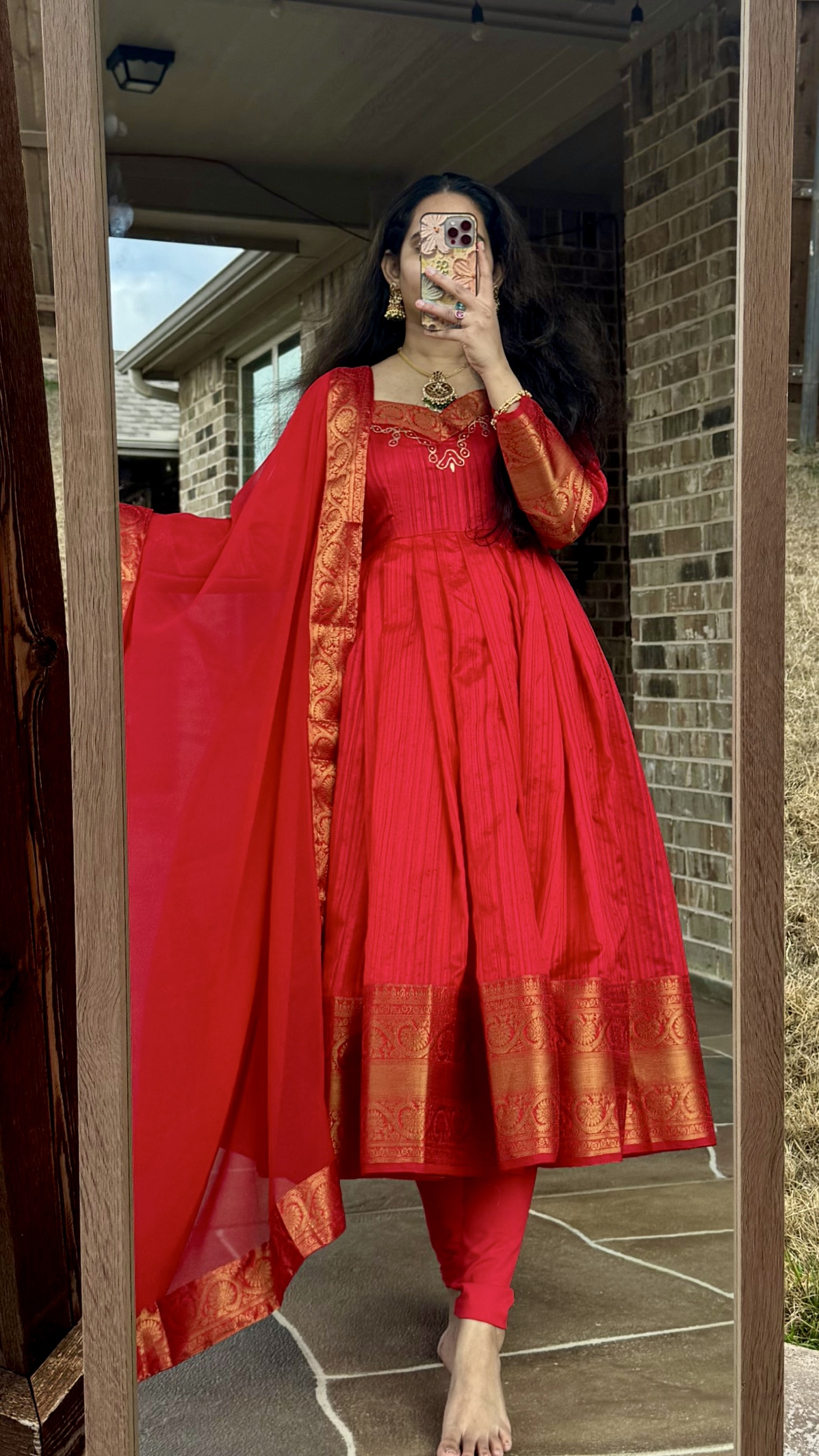 Kanchi pattu Anarkali with gold zari butis all over the frock flare is 6-7 meters Duppata is 3 meters comes with lining, dress is completely stitched zip is attached with dori