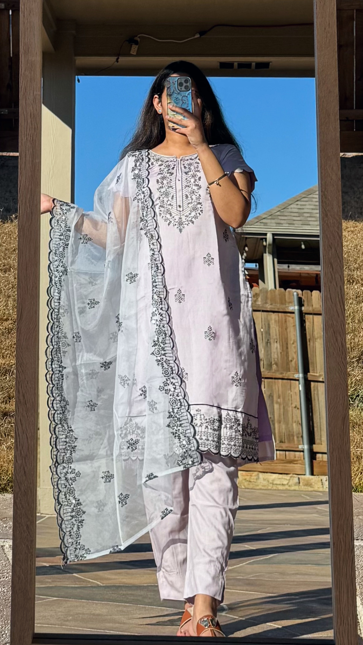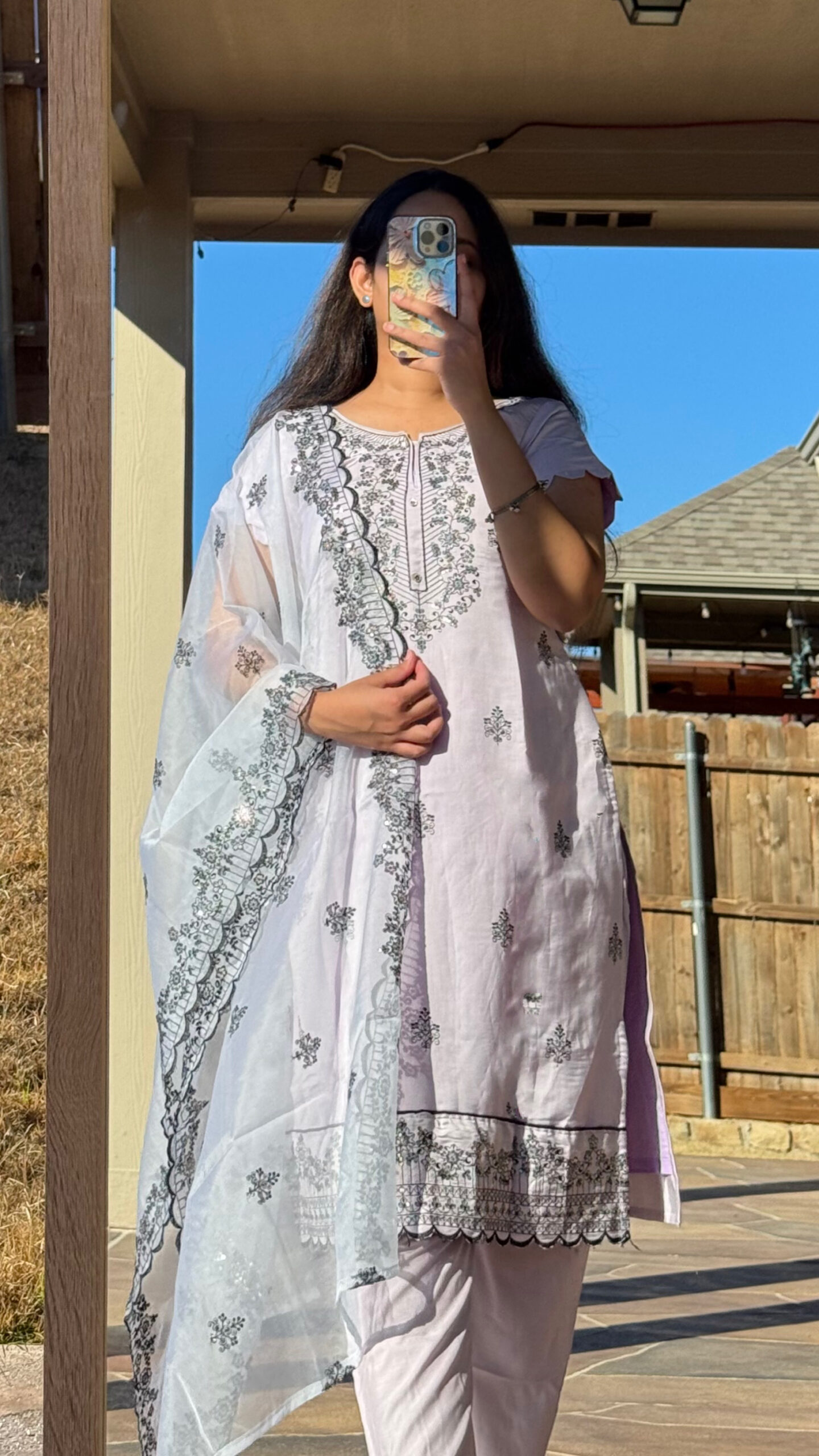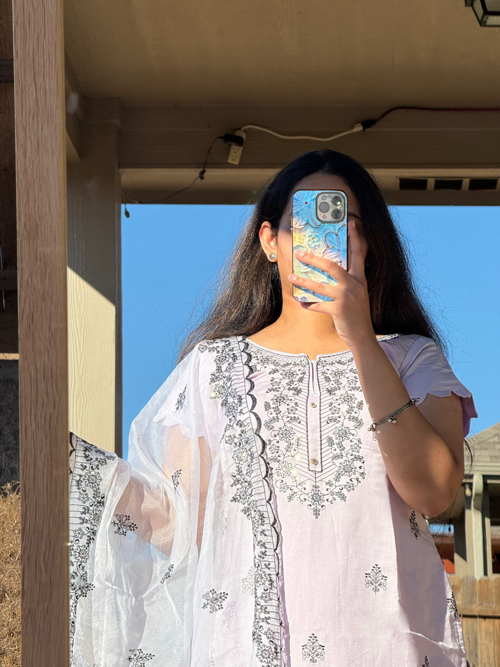 Organza tissue fabric sharara with scallop embroidery on anarkali comes with Duppata and a pouch bag