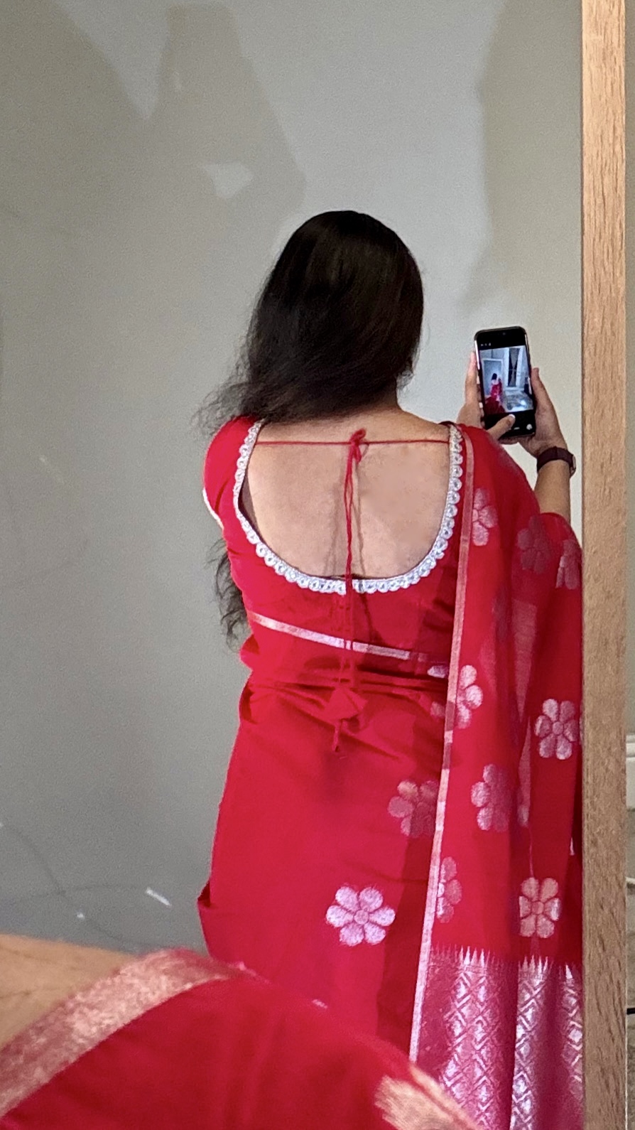 Zarikota fabric with gold zari border and flower butis all over the skirt comes with lining