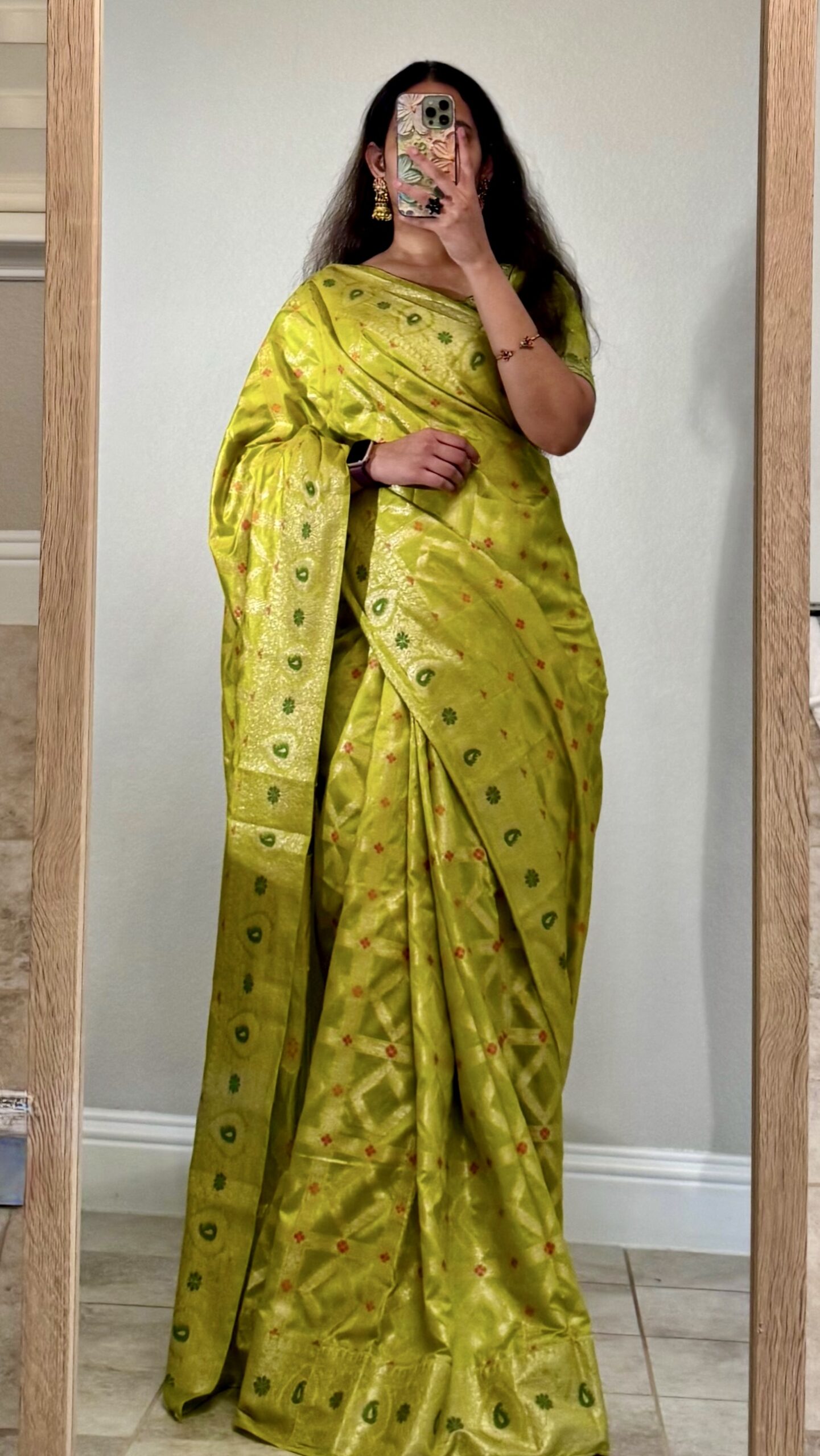 Zarikota fabric with gold zari border and flower butis all over the skirt comes with lining