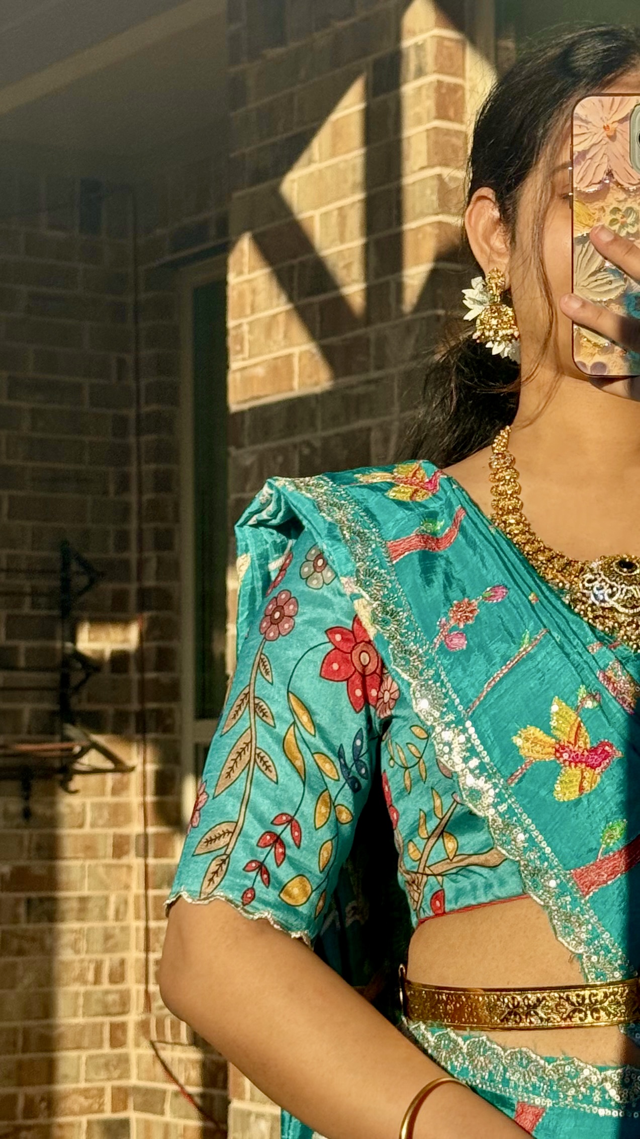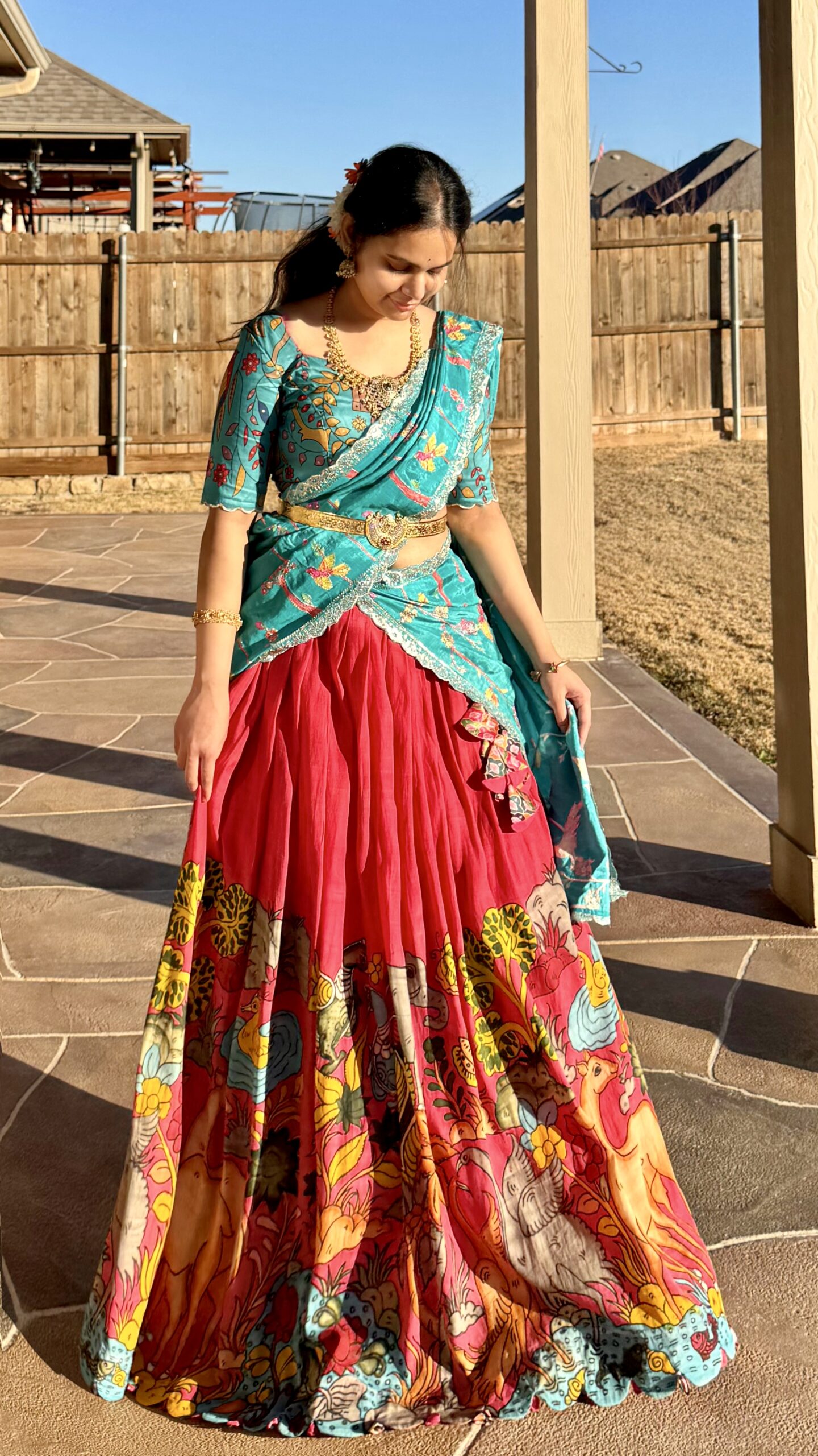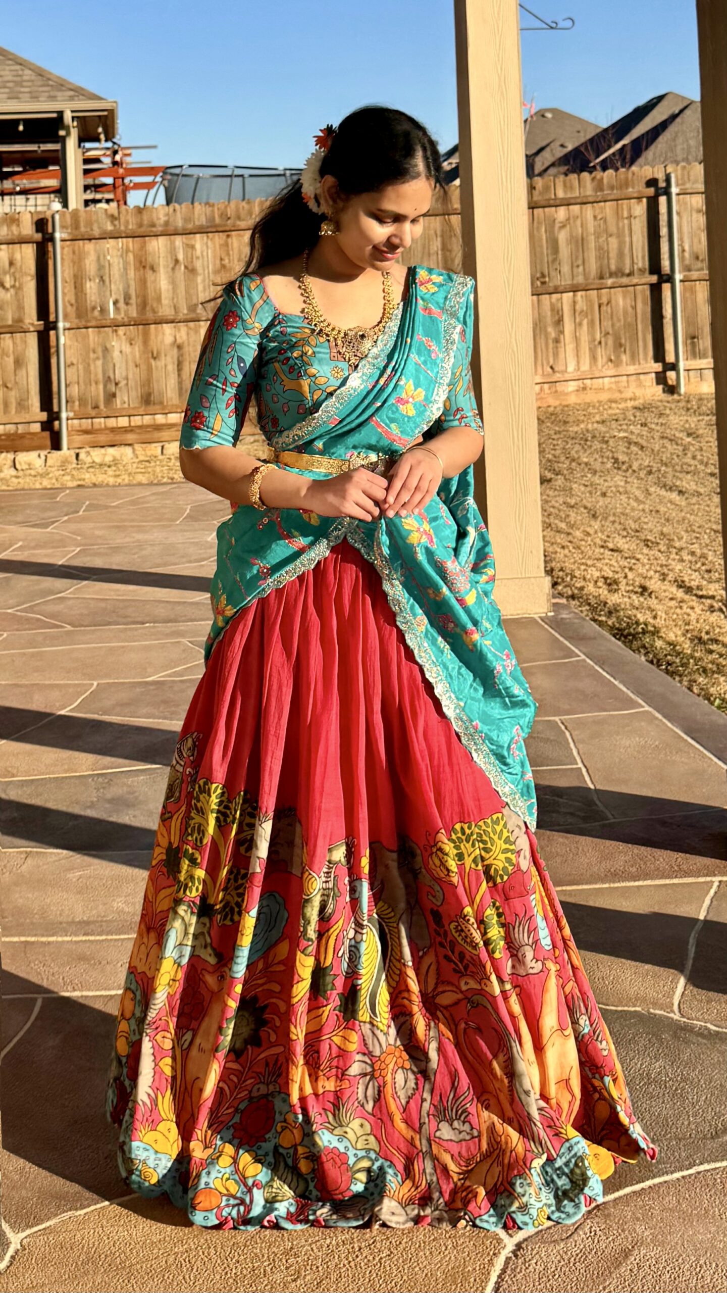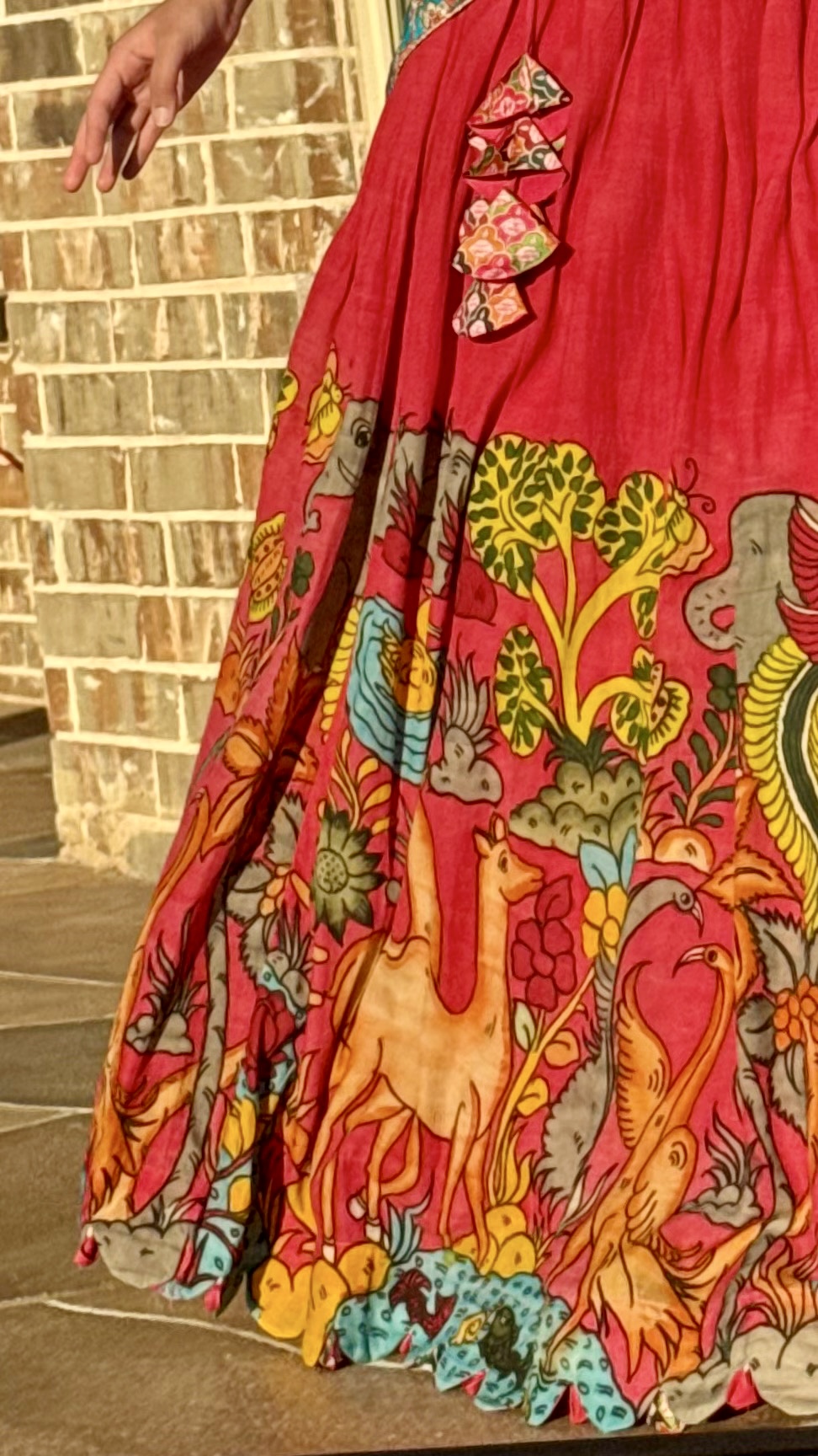 fabric details : hand painted/drawn( no chemical) pure kalamkari coloured fabric with embroidered silk duppata