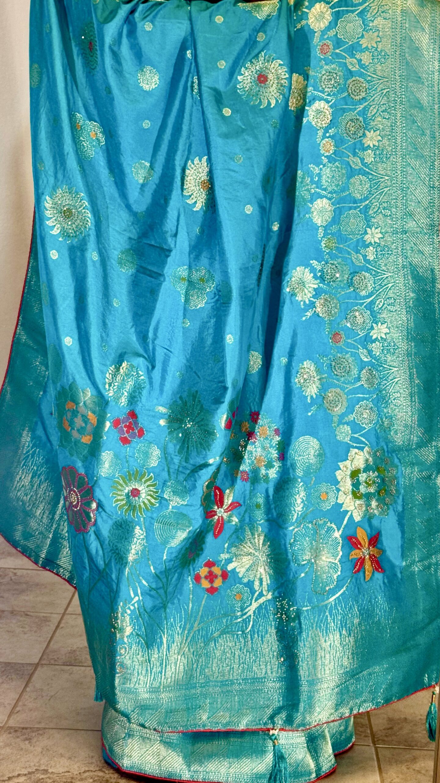 Soft pattu halfsaree with gold zari border and muslin pearl embroidered duppata lehenga flare 6 meters comes with lining dress is completely stitched