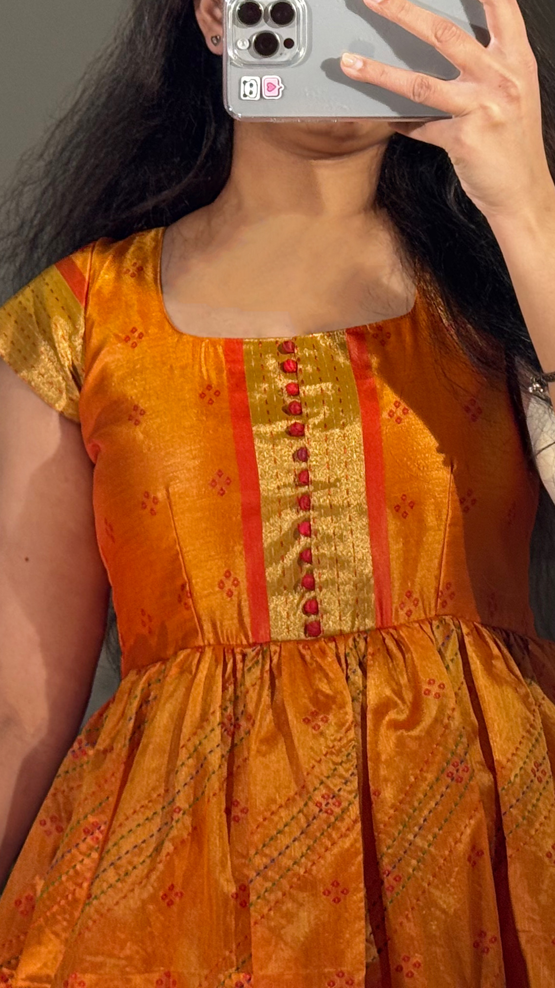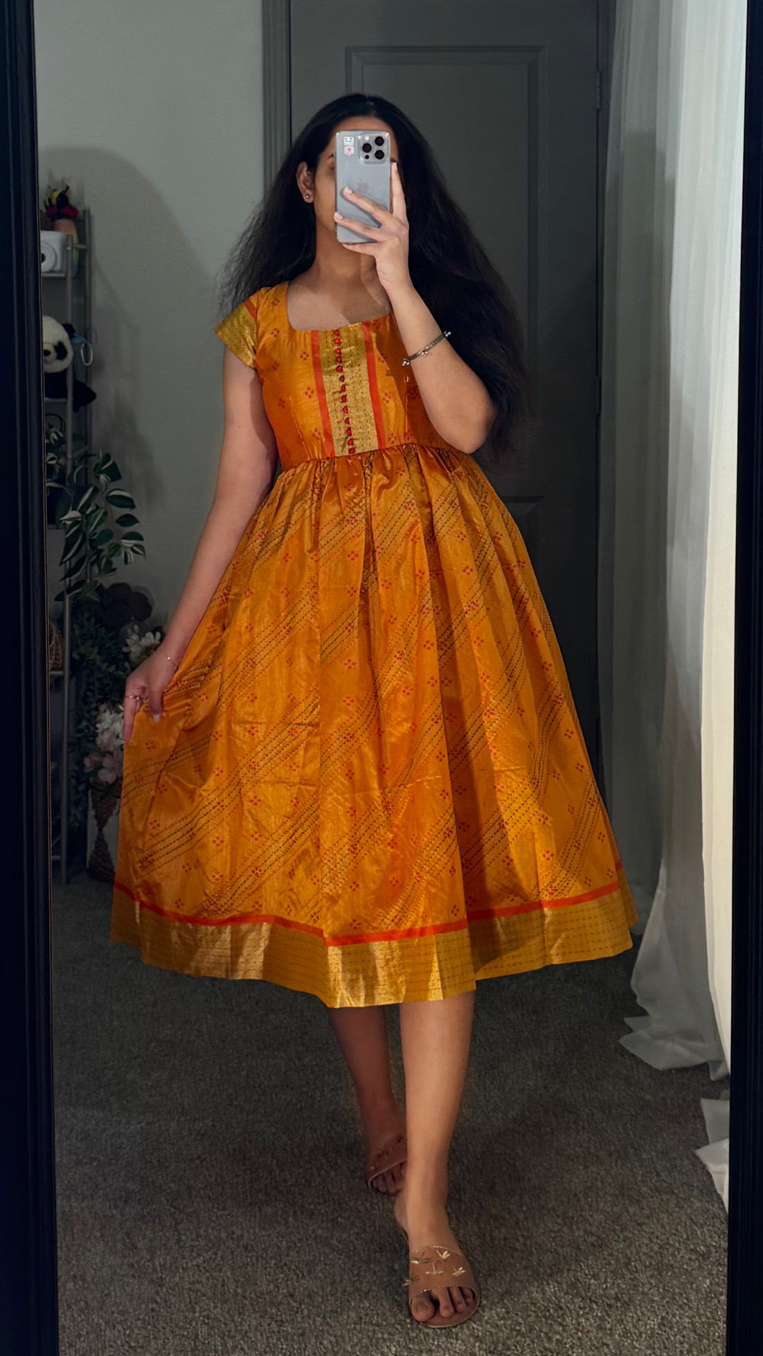 Sungudi handloom fabric with gold zari border with frills on yoke part sleeves can be customized comes with lining zip is attached
