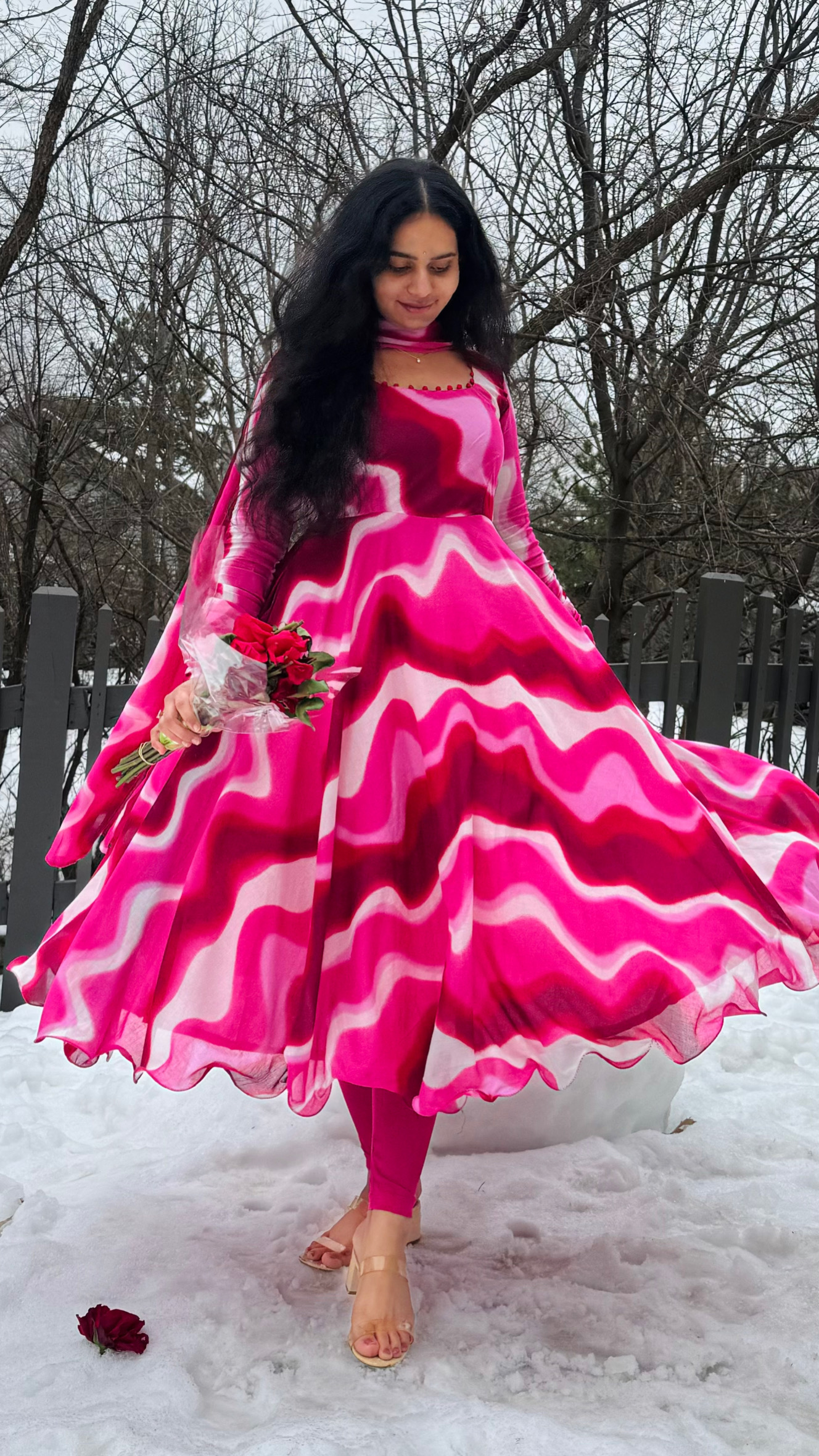 Soft muslin silk fabric alia cut frock with digital printed flowers embroidered with kundans on yoke part