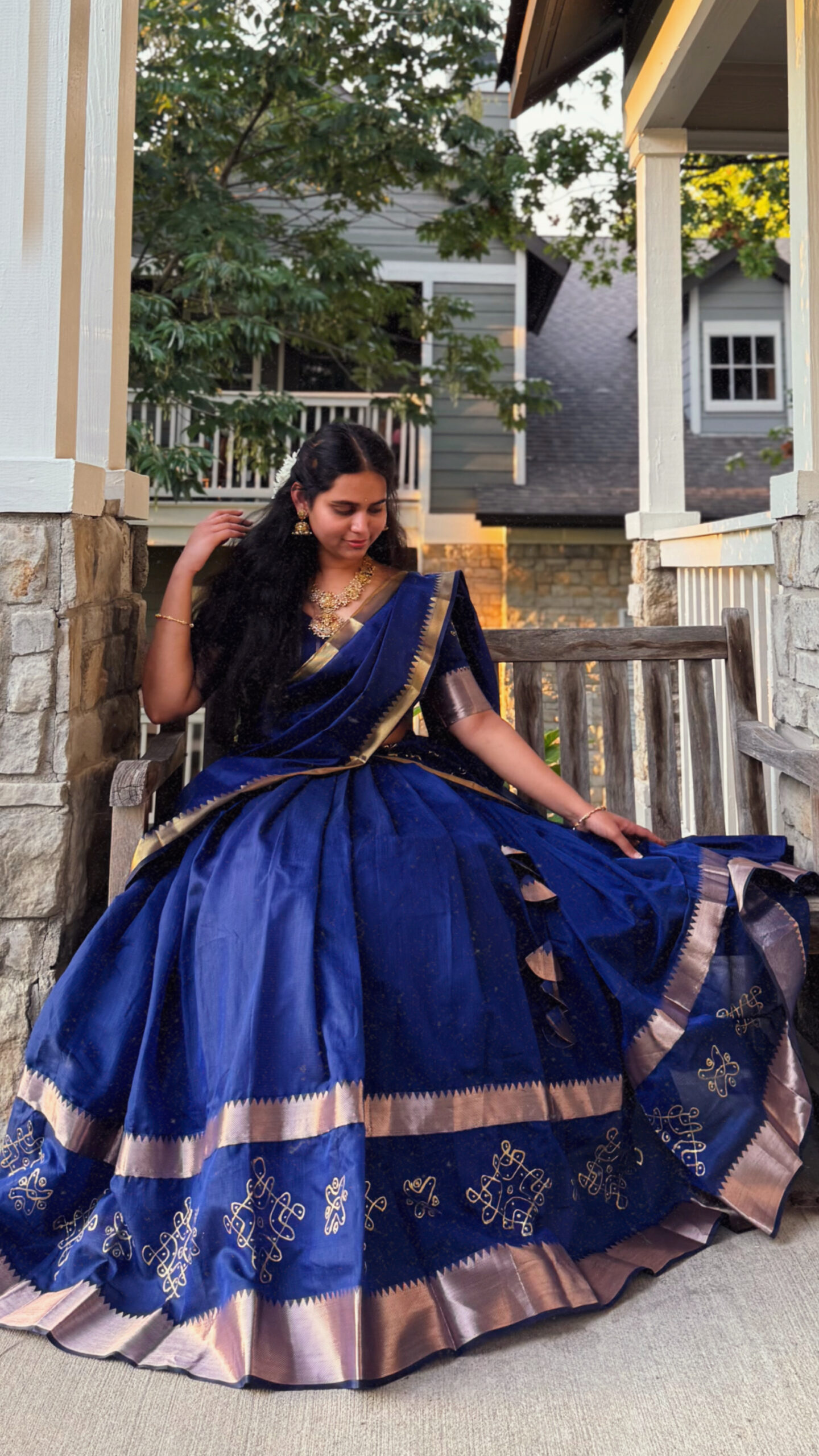 Soft pattu halfsaree with gold zari border and muslin pearl embroidered duppata lehenga flare 6 meters comes with lining dress is completely stitched