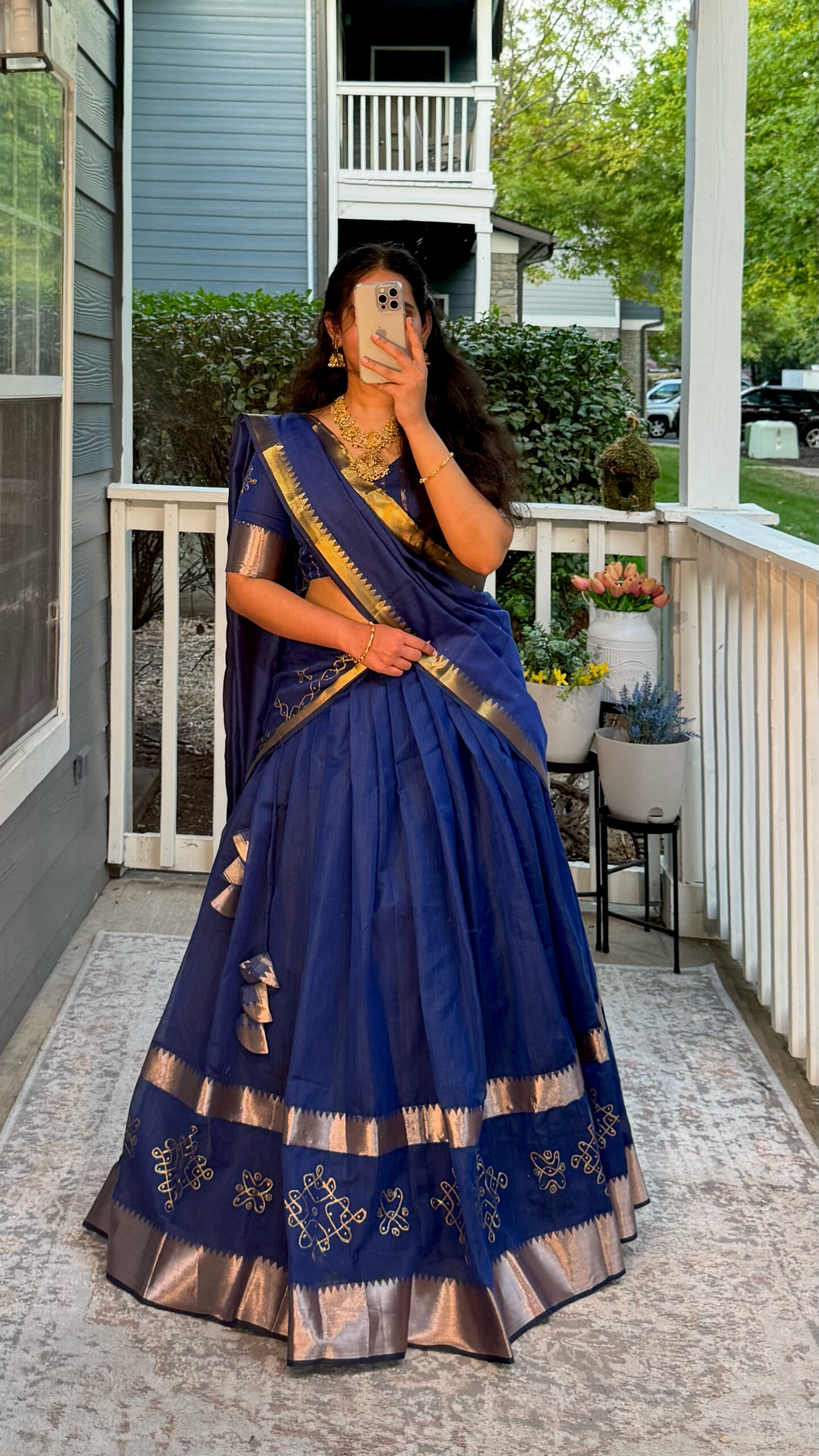 Narayanpet cotton half Saree with georgette duppata comes with lining lehenga flare 5-6 meters blouse has Doris and hooks on back