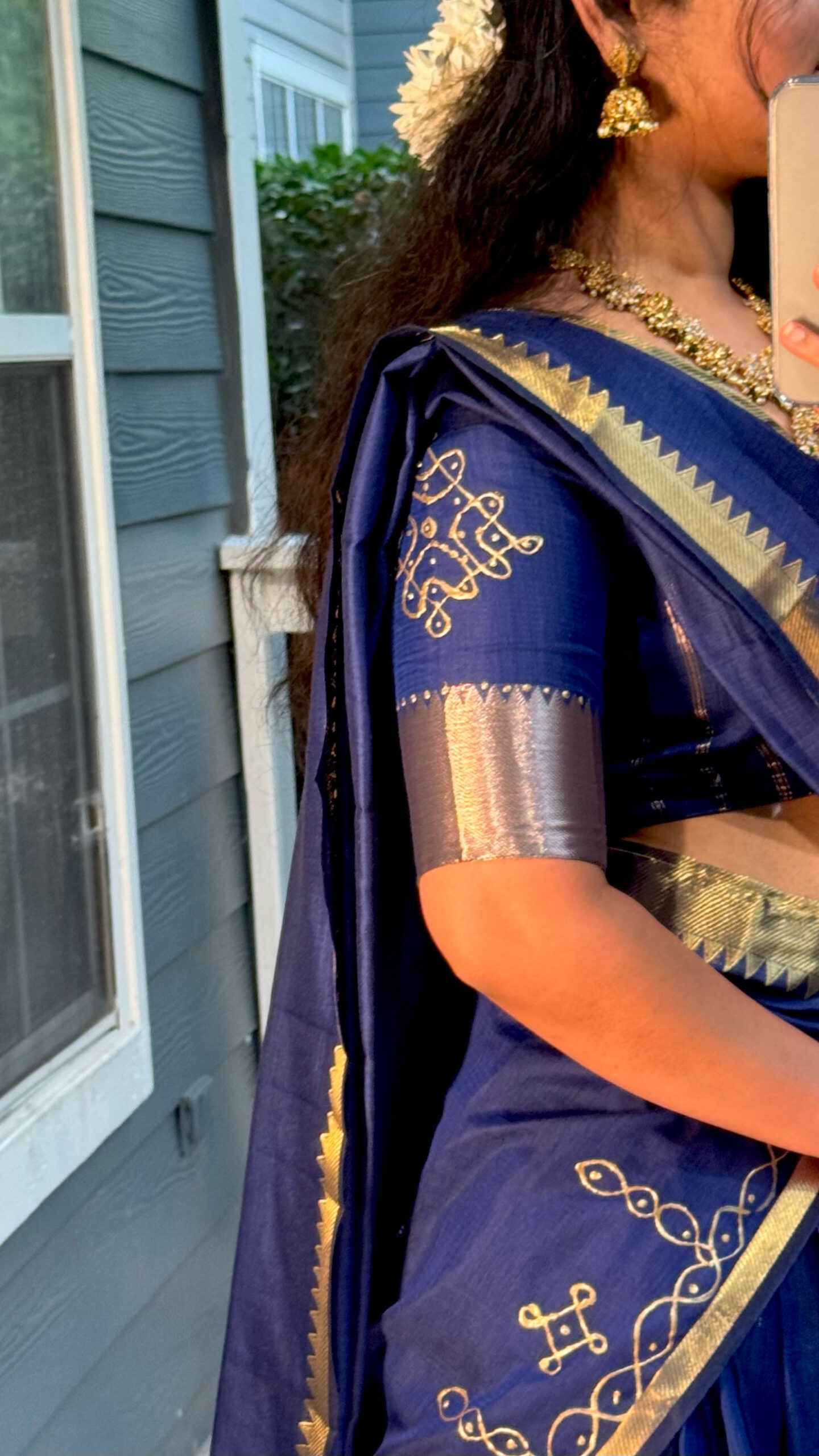 Sungudi cotton handloom half Saree with gold zari borders representing the traditional peacock motives on border
