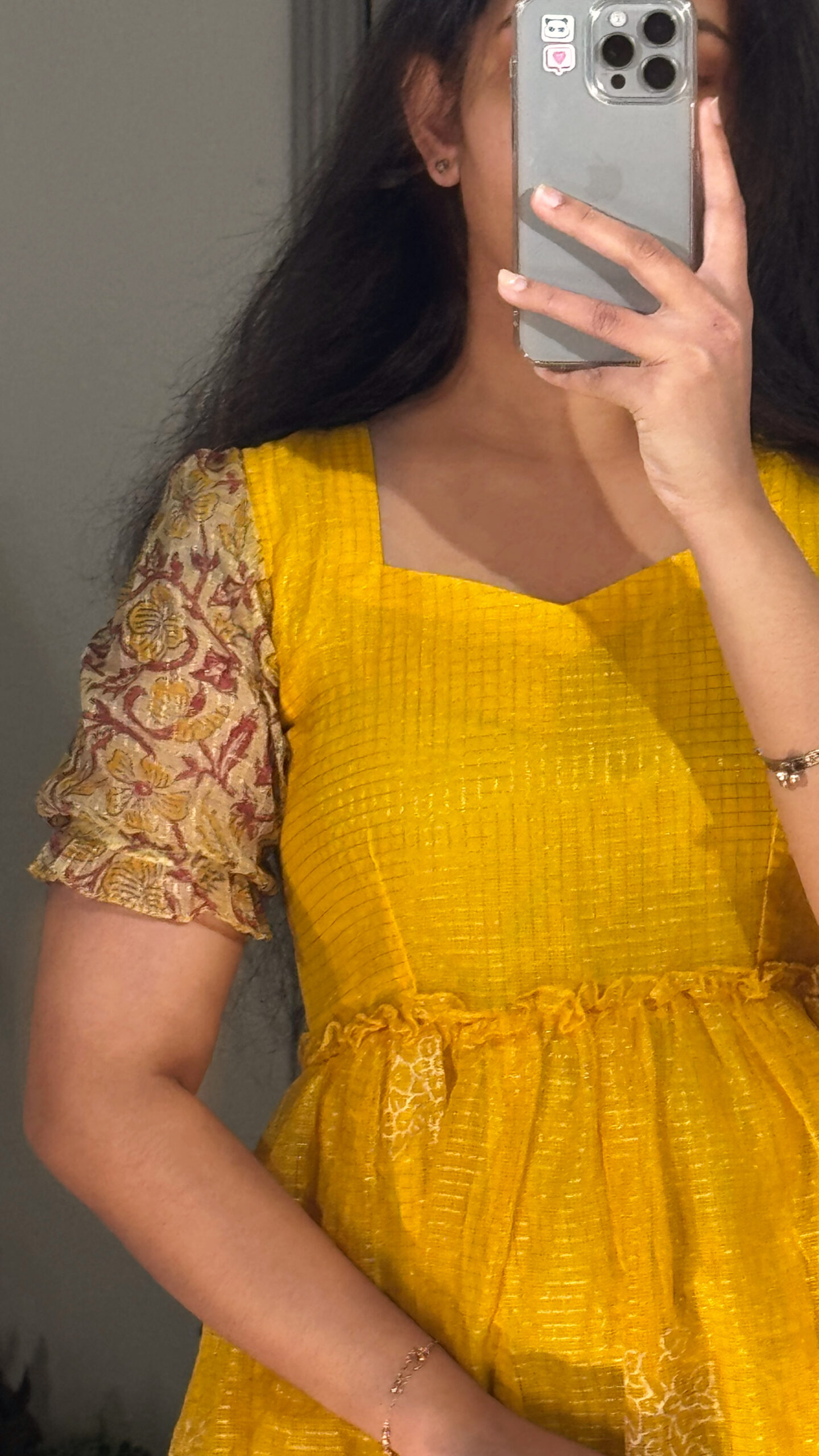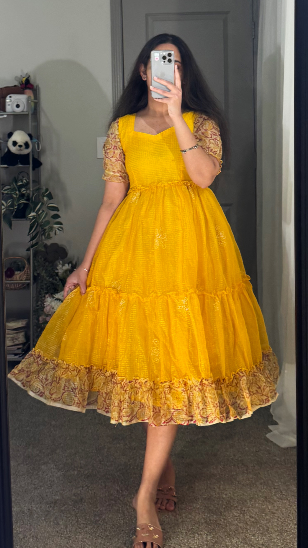 Sungudi cotton handloom fabric with gold zari border zip is attached to frock comes with lining